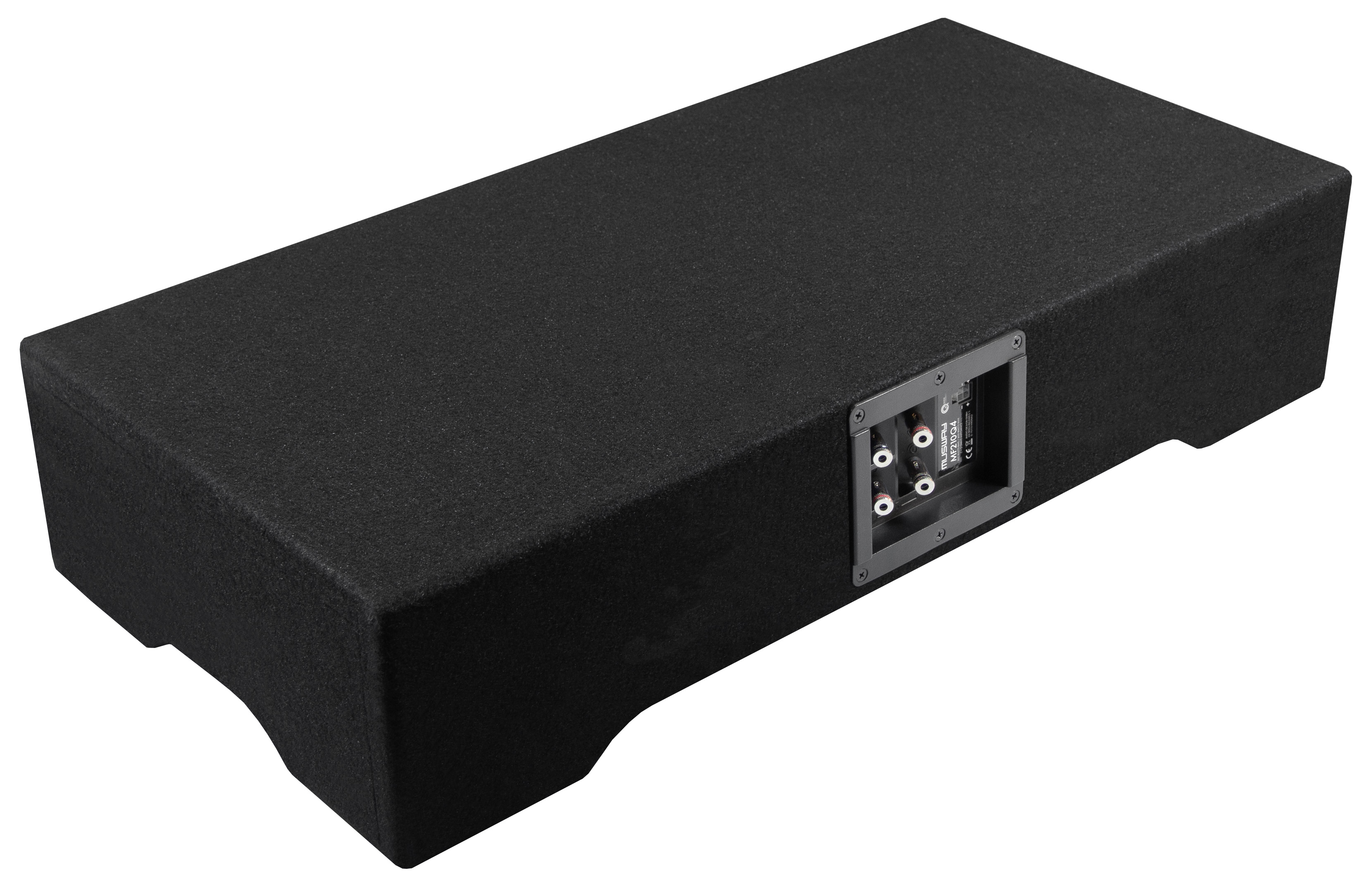 Wem handelsübliche Subwooferboxen zu groß und sperrig sind oder keinen Platz in der Reserveradmulde hat, wird jetzt im Musway Programm mit den neuen, nur 15 cm hohen MF210Q4 Downfire-Boxen fündig werden. Bei diesen Neukonstruktionen sind die Membranen optimal geschützt, da sie quasi unsichtbar nach unten abstrahlen. Gleichzeitig geht im Kofferraum so gut wie kein Stauraum verloren. Um einen großen 25 cm Subwoofer in eine kleine Box integrieren zu können, nutzen die Musway Ingenieure einen cleveren Trick: Anstatt eines Bassreflexrohres, das viel Platz und damit wertvolles Innenvolumen beansprucht, verwenden sie in den MF210Q4 Boxen eine zweite, passive Membran. Diese erzeugt den gleichen Effekt wie eine Bassreflexabstimmung, spart aber deutlich an Platz und verhindert unerwünschte Strömungsgeräusche. Die Passivmembranen sind aus hochfestem Glasfaser gefertigt, um dem inneren Druck gut standzuhalten und perfekten Klang zu gewährleisten. Die stabil konstruierten MDF-Gehäuse sind mit hochwertigem schwarzem Teppich bezogen und fügen sich harmonisch und dezent in jedes Fahrzeuginterieur ein. Weiterhin sind ohne Ausnahme alle Modelle mit Quick Connect Anschlussbuchsen ausgestattet und können blitzschnell per optionalem Anschlusskabel beispielsweise an die MUSWAY M6 und deren Quick Connect Terminal angeschlossen werden. Selbstverständlich können die MUSWAY Subwoofer-Systeme auch konventionell an herkömmliche Push-Pin Terminals angeschlossen werden.