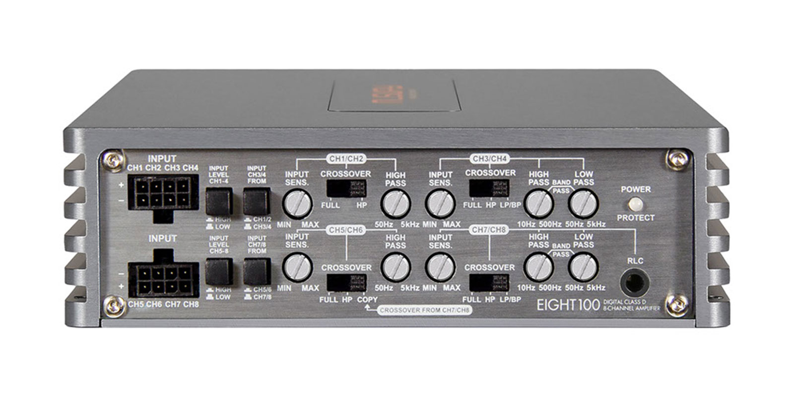 - 8 x 100/180 Watt RMS @ 4/2 Ohm oder 4 x 360 Watt RMS @ 4 Ohm gebrückt